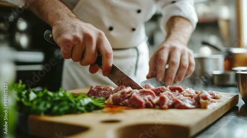 A restaurant or hotel might consider this simple recipe idea: A chef prepares a meat dish for lunch by cutting raw meat with a knife on a cutting board.