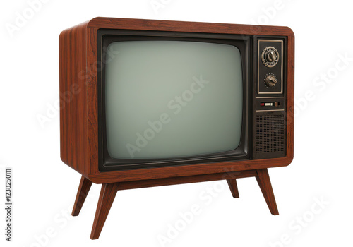 A retro television with a wooden frame, angled legs, and a rounded screen, isolated on a white background
