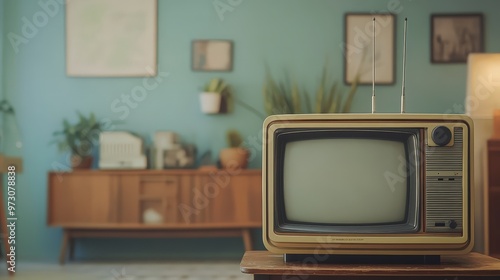 A retro television with rabbit ear antennas and a manual channel switch, set in a nostalgic living room,
