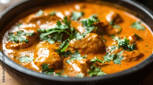 A rich and flavorful Indian butter chicken curry, served with creamy sauce and garnished with fresh cilantro.