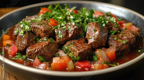 rich, beef, its, tender, edge, gentle, bite, nestled, vibrant, tapestry, leafy, greener