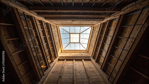 A rich perspective from the floor up towards the skylight capturing the glowing light filtering through the cover illuminating the raw construction materials nearby.
