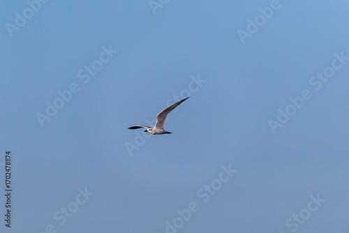 A ring-billed gull flying away in Marine National Park on the outskirts of Jamnagar, Gujarat