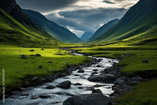 landscape, cloud, grass, nature, mountain, water, vale, sky, highland, wilderness, mountain chain, mountain river, fell, river, green, stream, flowing, scenic, mountain, waterway, lush, serene, countryside, meandering