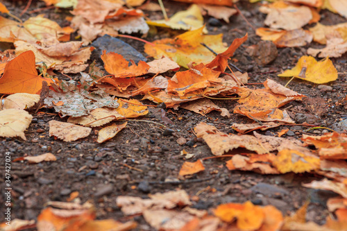 A road in the forest, dotted with fallen yellow and red leaves. Warm autumn day.