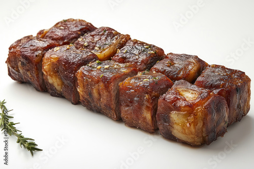 roasted, meat, diced, laid, out, row, covered, glaze, giving, delicious, shine, sprinkled, seasoning, including, sesame, herb, dish, look, juicy, crispy, crust, outside, soft, rich, layer, inside, left, corner, frame, you, can, see, sprig, fresh, rosemary, adding, favor, aesthetic, completeness, composition, background, minimalist, texture, appetising, appearance, bar-b-q, baked