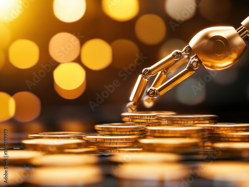 A robotic hand reaches for gold coins, symbolizing the intersection of technology and finance amid a blurred, warm background.