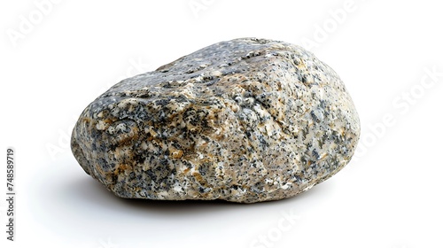 A rock isolated on a white background. The rock is gray and has a rough texture. It is about the size of a softball.