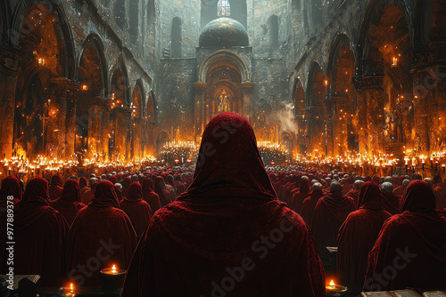 A Romanesque church filled with monks chanting Christmas hymns during a midnight service. Concept of Christmas in the Romanesque period.