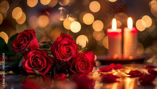 A romantic candlelit dinner with a bouquet of red roses and a bokeh effect, promoting a Valentine's Day celebration, Free space for text Valentine's Day concept
