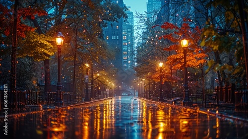 A romantic city street lit by lampposts at night, capturing the beauty and magic of a beautiful song.