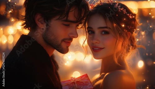 A romantic couple sharing an intimate moment, with a man presenting a gift to a woman adorned with fairy lights