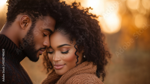 A romantic couple standing together in a field at sunset, their love and connection shining through, perfect for commercial use in wedding, engagement, and lifestyle branding. Commercial