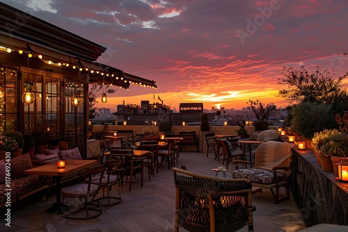 A romantic rooftop restaurant at sunset. Tables are set for dinner under a vibrant sky, overlooking a cityscape. String lights add to the ambiance.