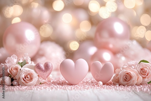 A romantic setup featuring pink balloons and pink roses beautifully arranged on a table, perfect for celebrating Valentine's Day.