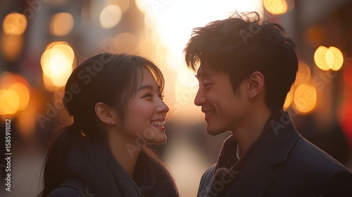 A romantic silhouette of a love couple standing close together, leaning in for a kiss under sunset light at city street