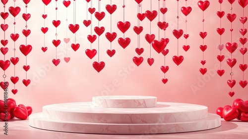 A Romantic Valentine's Day Presentation with a White Marble Platform Adorned with Suspended Red Hearts