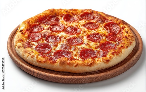pizza, pepperoni, cheese, round, wooden, platter, topping, slice, melted, crispy, crust, food, delicious, hot, italian, baked, tasty, savoury, fast, meal, lunch, dinner, ready, eat, red, brown, gold, rustic, fresh, oven, homemade, eatery, image, photo, closeup, isolated, white, background