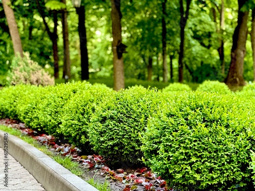 A row of beautiful round boxwoods in a city park. Landscaped garden with boxwood balls.