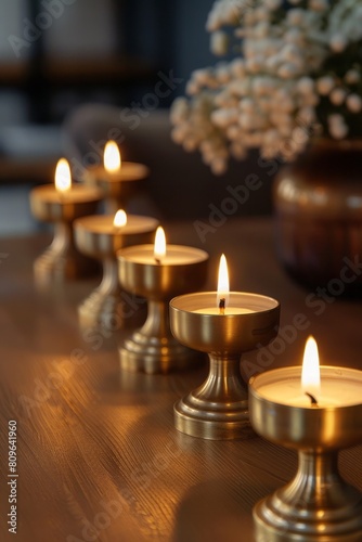 A row of brass candle holders with flickering candles sitting on top of a wooden table, creating a warm and inviting ambiance.