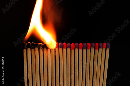 A row of burning matches on a black background. The flame moves from the match to the match. Fire is inevitable
