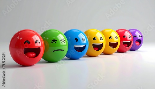 A row of colorful 3D rendered emoji balls expressing a variety of emotions, from happy to sad, arranged on a white surface