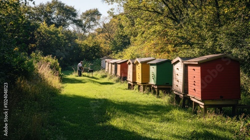A row of colorful beehives in a lush green landscape with a person tending to them.