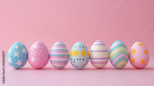 A row of colorful Easter eggs against a pink background.