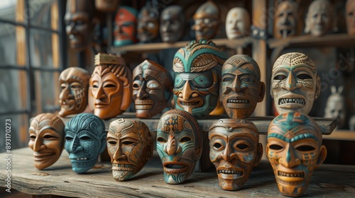 A Row of Colorful Masks Are Displayed on a Wooden Shelf Next to Each Other - Generative AI
