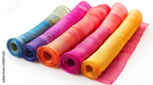 A row of colorful rolls of fabric