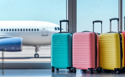 A row of colorful suitcases near an airport window with a plane in the background, symbolizing travel and vacation.