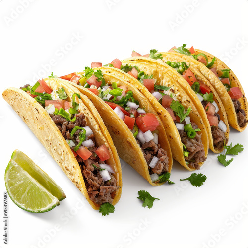 A row of delicious beef tacos with fresh toppings and a lime wedge on the side, photographed on a white background.