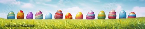 A row of easter eggs with colourful designs, celebrating Easter, over a beautiful field on a sunny day, wide resolution for banners of specific designs, generative ai