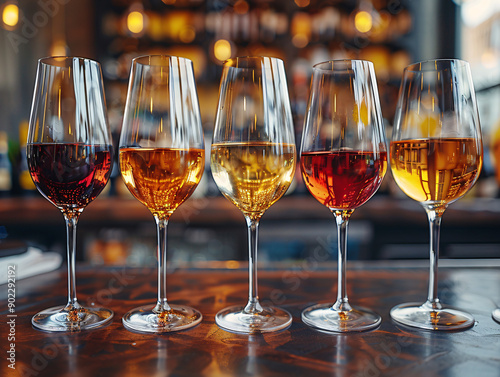 a row of five wine glasses, each filled with a different type of wine, placed on a bar in a restaurant.