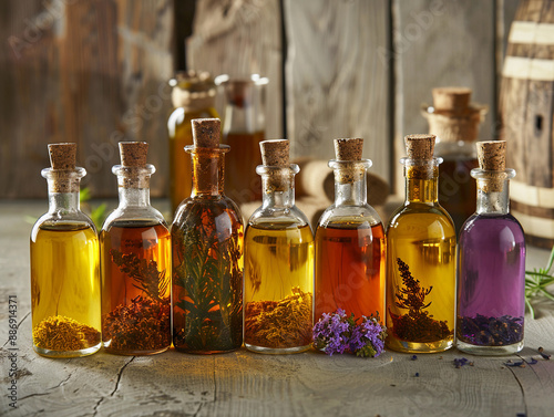 A Row of Glass Bottles Filled With Herbal Infusions on a Wooden Tabletop