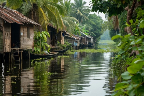 A row of houses situated on the side of a river, creating a charming riverside scene, A quiet backwater with traditional boathouses, AI Generated