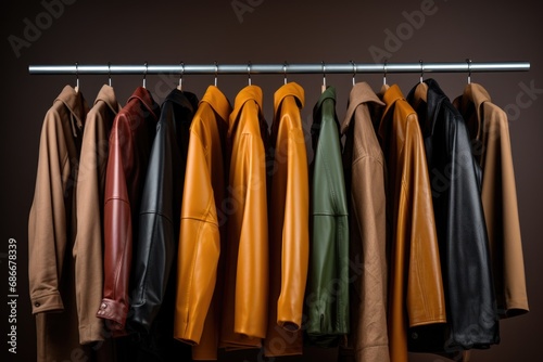 A row of leather jackets hanging on a rail. Perfect for fashion or retail industry advertisements.