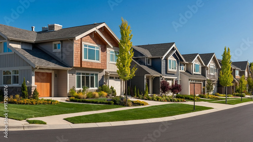 A row of modern suburban homes in a clean and well-maintained neighborhood on a sunny day with clear skies.