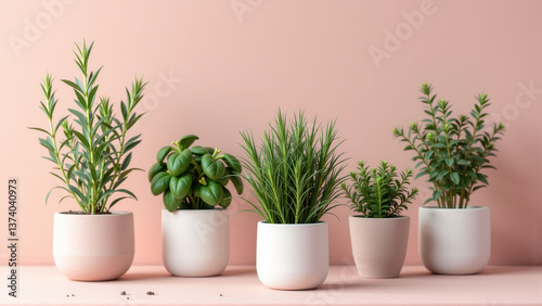 A row of potted plants sit on a pink background. The plants are of different sizes and types, including a small green plant and a tall green plant