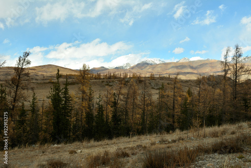 A row of rare coniferous forest on the edge of a picturesque valley in the mountains with snow-capped peaks on an autumn sunny day.
