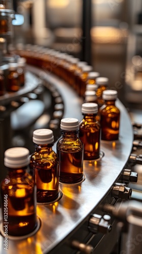 A row of small amber bottles is being capped and labeled on a modern production line, showcasing an automated process in a manufacturing environment