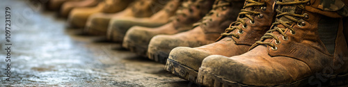row, sturdy, national, guard, boot, polished, ready, duty, military, service, professionalism, footwear, preparation, uniform, discipline, readiness, strength, commitment, resilience, pride, protection, dedication, gear, toughness, support, coordination, training, sharpened, responsibility, security, uniformity, precision, performance, tradition, teamwork, survival