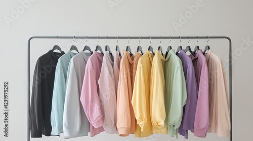 A row of unisex oversized shirts hanging on a sleek metal rack, styled in bold and pastel hues.