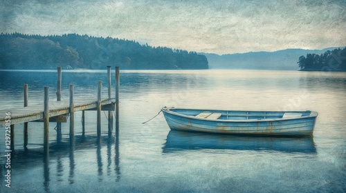 water, boat, lake, dock, reflections, serenity, calm, peaceful, blue, stillness, nature, landscape, tree, sky, horizon, misty, fog, tranquil, scenery, wooden, plank, pole, ripple, rope, anchored, dawn, dusk, morning, evening, quiet, isolated, minimalist, outdoors, environment, natural, scenic, light, dark, green, distant, shoreline, texture, moody, picturesque, journey, travel