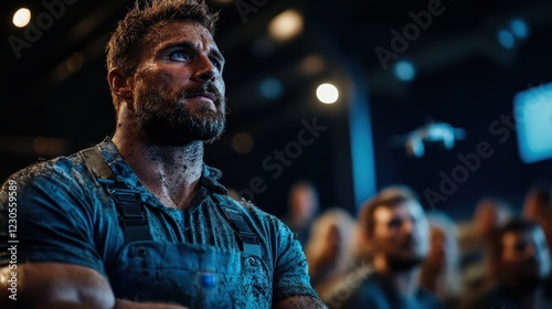 A rugged, muscular man with an intense look is captured in a gritty setting, reflecting dedication and hard work, while inspiring viewers through his focused demeanor and strong presence.
