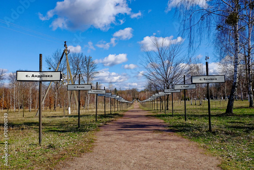 path, signs, park, tree, grass, rural, landscape, distance, sunny day, blue skies, cloud, view, day, outdoors, nature, scenery, alley, historical building, memorial, accident, zone, exclusion, chernobyl, ukraine, pollution, name, village, disaster, cemetery, dangerous, nuclear, radiation, signboard, abandoned, 1986, radioactivity, ecology, desolate, complex, apocalyptic