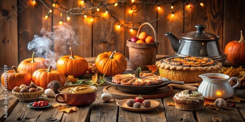 A rustic autumnal table setting with steaming coffee, pumpkin pies, and a teapot, creating a warm and inviting ambiance.