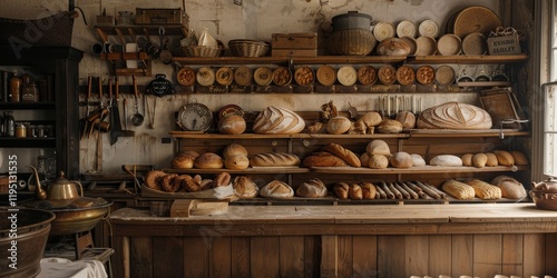 bakery, bread, loaf, shelf, wooden, rustic, kitchen, flour, dough, pastry, crust, baking, ingredient, tool, counter, vintage, artisanal, food, display, warm, natural, culinary, fresh, traditional, homemade, variety, round, baguette, crusty, gold, soft, massaging, oven, utensil, pantry, atmosphere, cosy, wholesome, texture, aroma, scene, preparation, craft, nourishment, culture