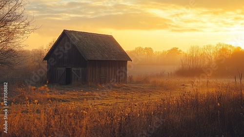 A rustic barn at sunrise, surrounded by misty fields and tall grass.