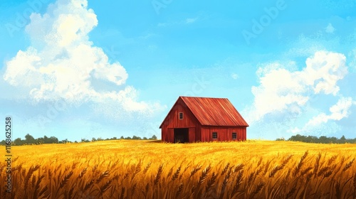 A rustic barn surrounded by a field of golden wheat, under a wide, open sky with a few fluffy clouds, creating a charming rural backdrop.